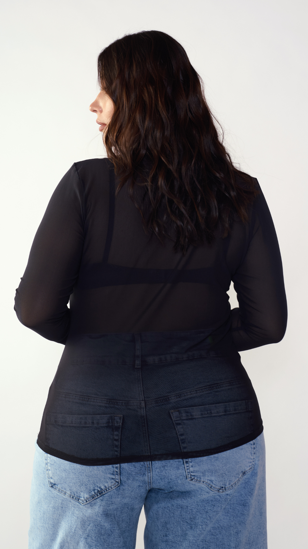 Your after-dark essential. The DISCOLA® Mesh “Celes” Top wraps you in soft, sheer mesh with a semi–mock neck and long sleeves. Stretchy, breathable and designed for curves, it layers effortlessly under blazers or shines on its own.