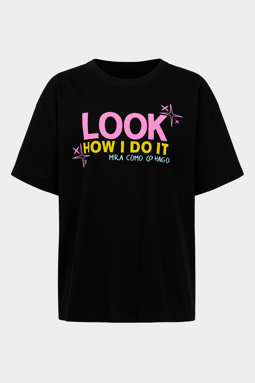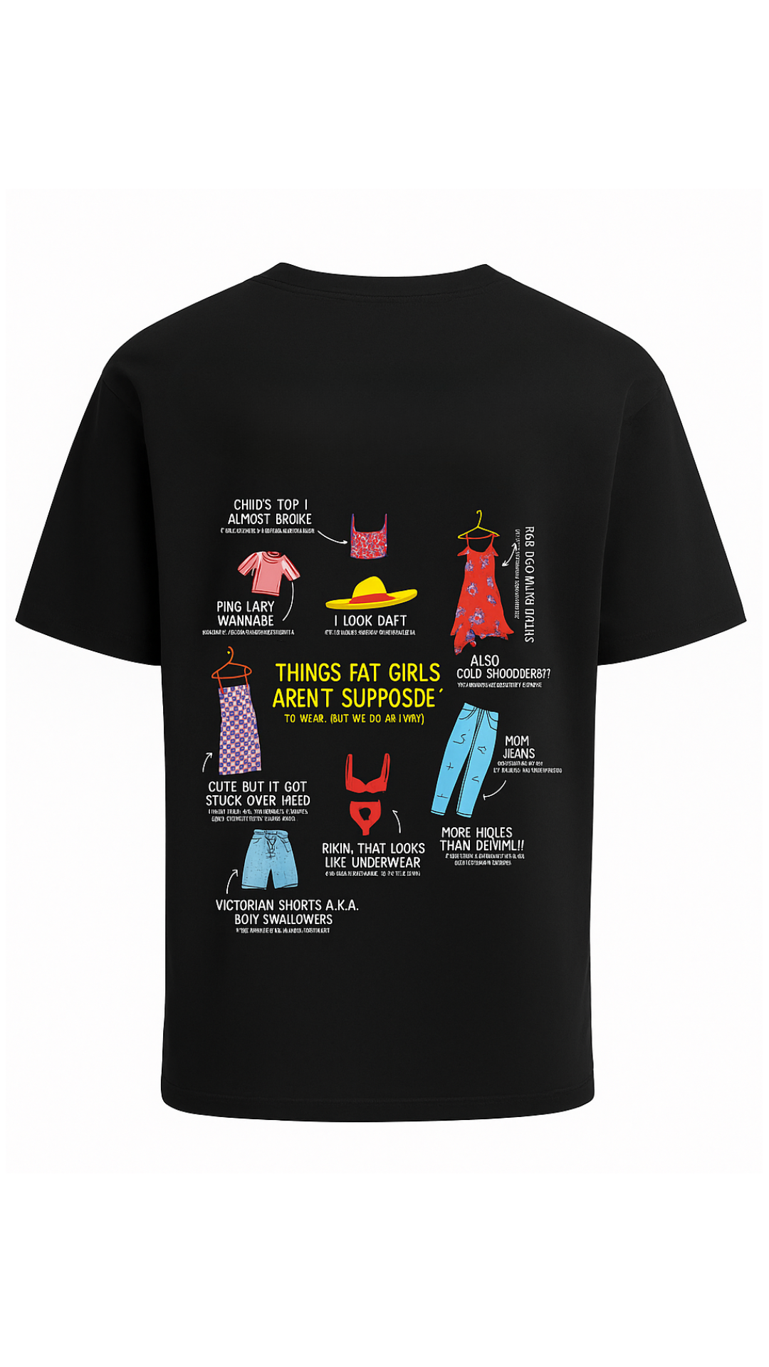 Step into confidence with the LOOK HOW I DO IT Oversize T-shirt in black. Made from 100% cotton, this bold tee makes a statement on both sides: the front features the colorful “LOOK HOW I DO IT” graphic, while the back showcases the playful and empowering “Things Fat Girls Aren’t Supposed to Wear (But We Do Anyway 💅)” illustration. Perfect for casual looks, layering, or making your everyday outfit stand out with attitude.